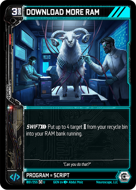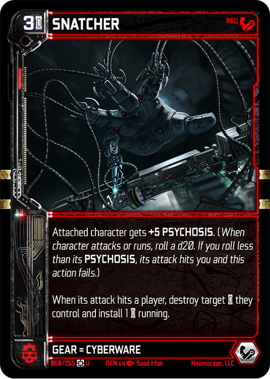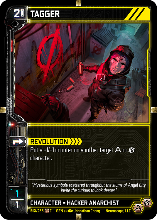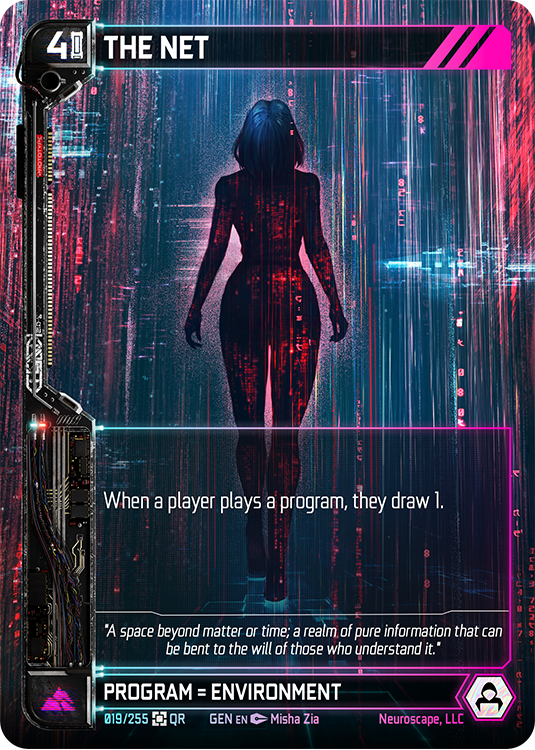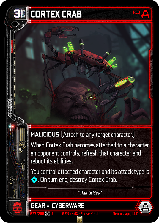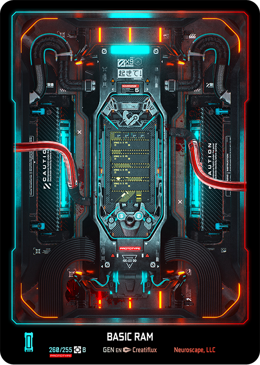 The chip implanted in your neck that runs the Neuroscape simulation. This card starts in play and unlocks powerful synergies as you get more characters from your chosen faction on the battlefield.